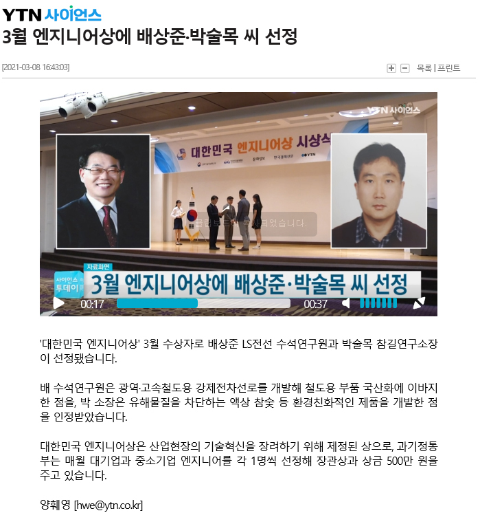"대한민국 엔지니어상" 2021년3월 수상 선정 보도자료 (ytn사이언스 영상 보도자료) 페이지 정보 작성자 최고관리자 작성일21-03-10 13:50 조회30,772회 댓글0건 관련링크 본문 ■ ytn사이언스 영상 보도자료 ■ 댓글목록 등록된 댓글이 없습니다. 이전글 다음글 목록